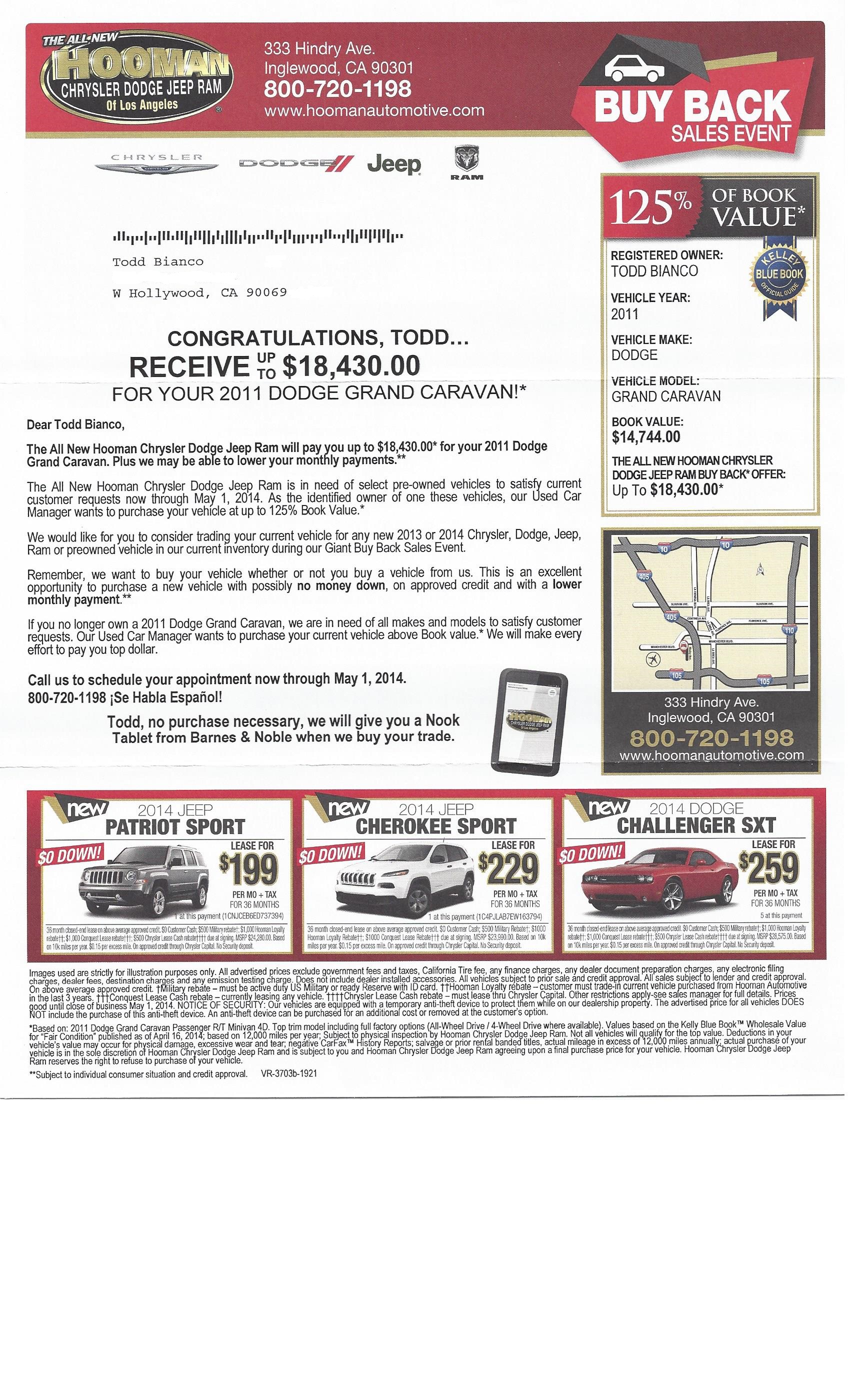 I received a flyer in the mail from the “All-New” Hooman Chrysler Dodge Jeep Ram of Los Angeles – NOT conveniently located Inglewood. This is apparently the replacement for Buerge, but I wonder why I got a flyer for my minivan but not my Charger. Odd. However, I won’t be taking either my 2012 Dodge Charger or my 2011 Dodge Grand Caravan there for service. It looks like I’ll stick with Crystal Chrysler Jeep Dodge Ram Fiat in Cathedral City.