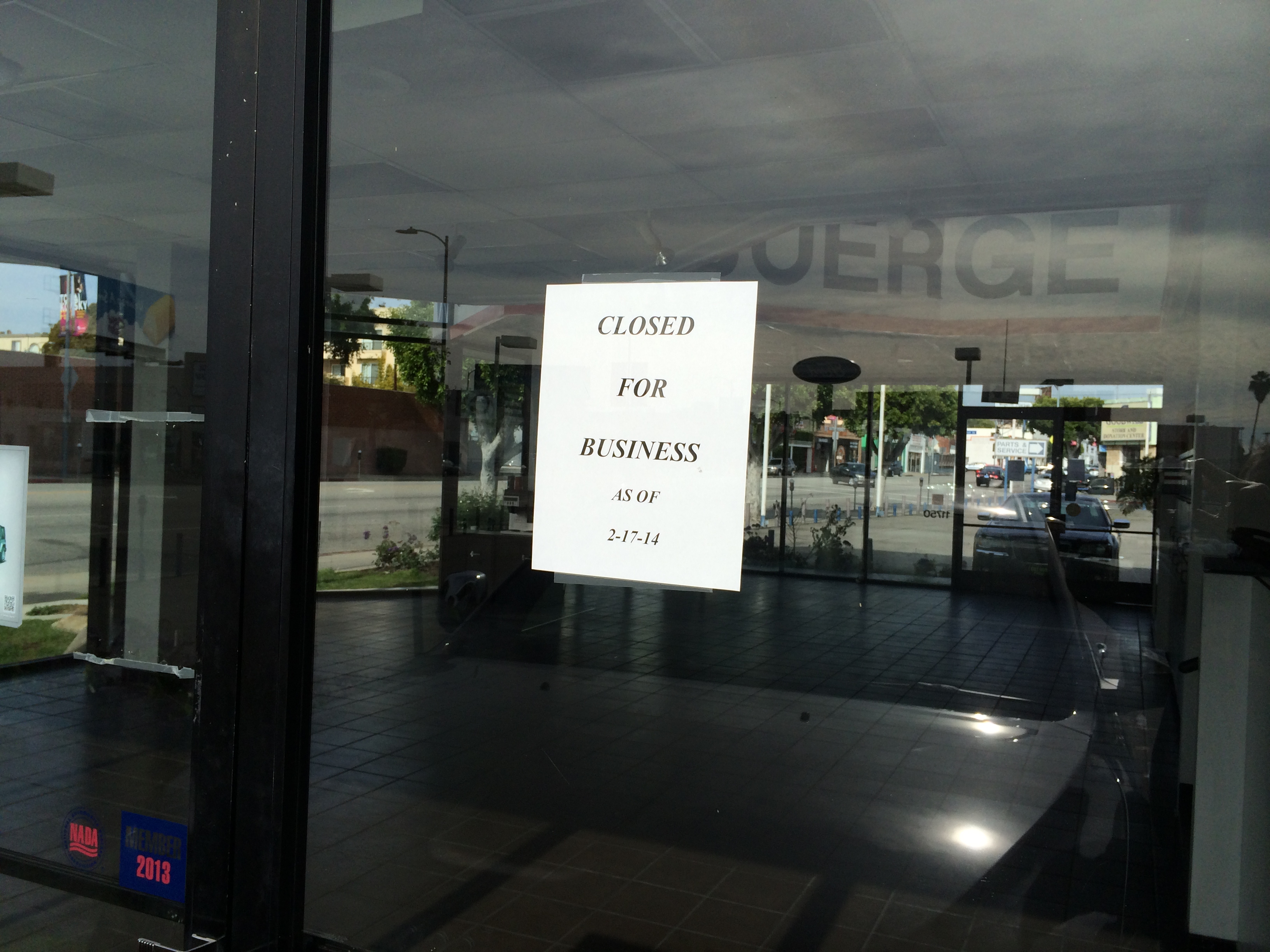 The dealership website is still online, but when you call the toll-free number, after the initial recorded voice, you’re connected to a fast busy signal. As the unceremonious notice on the door says, they are “Closed for Business as of 2/17/2014.”
