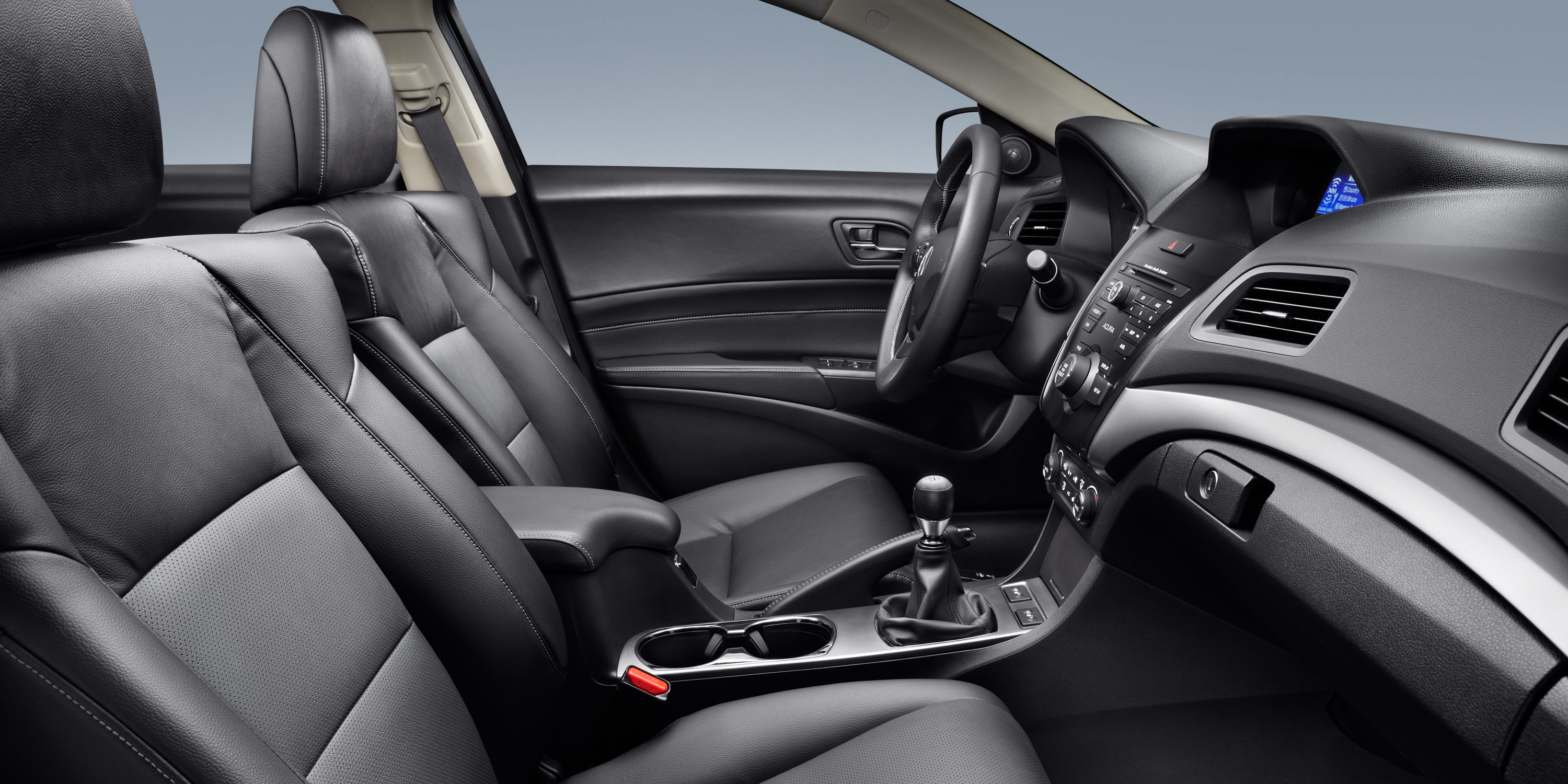 The ILX 6MT interior, with the Premium Package, shows the nice sports, power perforated leather seats. Cup holders are large and should suit American tastes.
