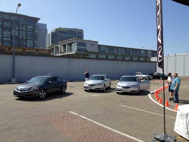 The Acura ILX All Access Ride & Drive Event was held in a parking lot across from Staples Center. In this picture, both Hybrid and 6MT models await drivers for the cross-town drive portion of the event.