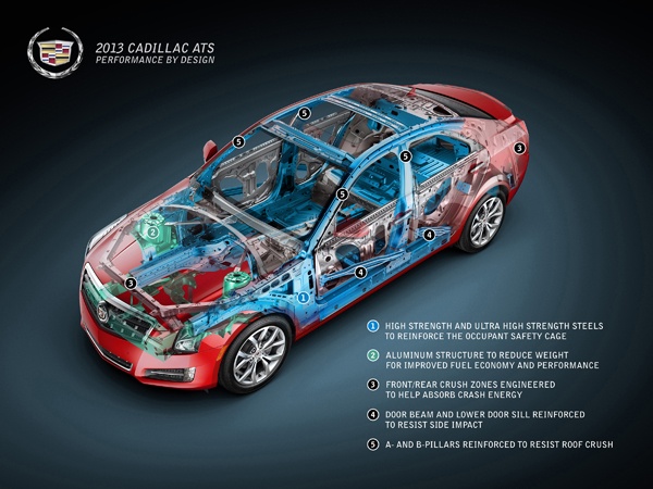 A cutaway of the 2013 Cadillac ATS shows how weight was saved by using aluminum and high-tensile steel.